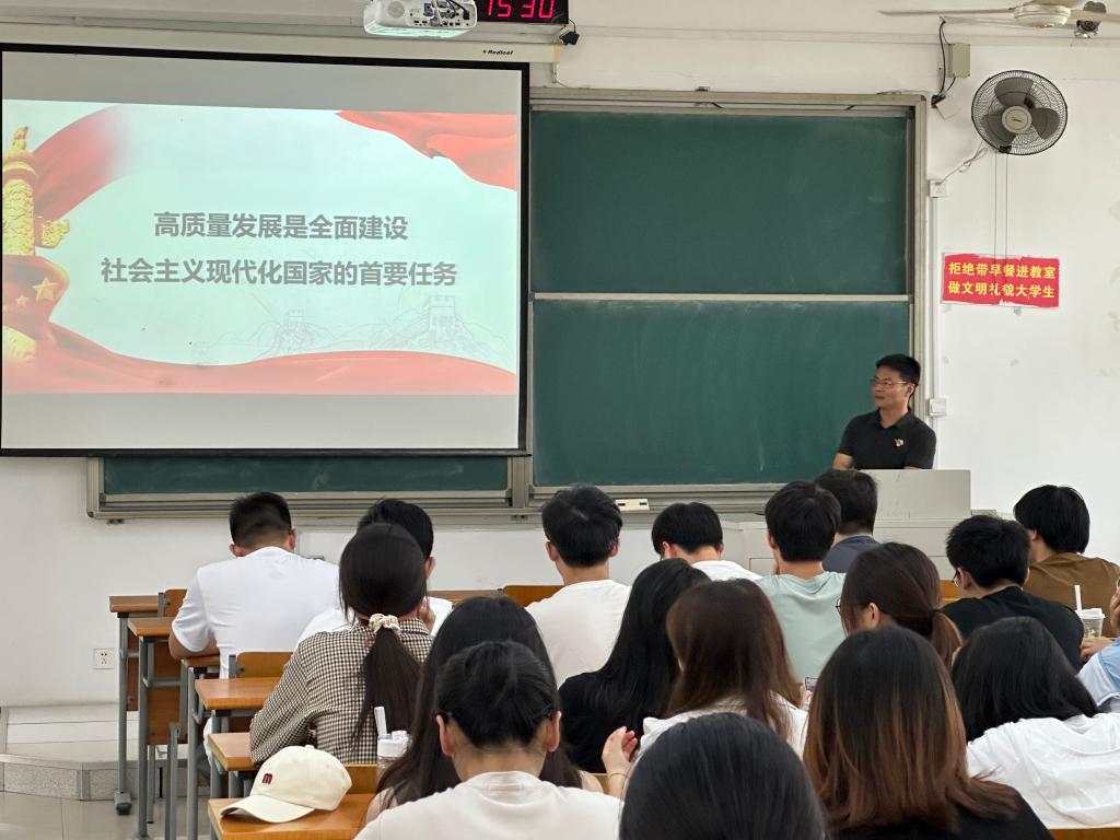 副院长杨朝辉以“高质量发展是全面建设社会主义现代化国家的首要任务”为主题,围绕高质量发展对于全面建设社会主义现代化国家的重要意义、新时代推动高质量发展取得的历史性成就、坚持以高质量发展为主题落实好各项经济工作三个方面内容进行了重点讲解和分析,从思想上、理论上为同学们释疑解惑。希望同学们深刻领悟“两个确立”的决定性意义,增强“四个意识”、坚定“四个自信”、做到“两个维护”,关注国内外形势变化,不断增强辩证思维能力,养成绿色生活方式,立足专业发展,展现新时代青年良好精神面貌,助力文旅融合高质量发展。