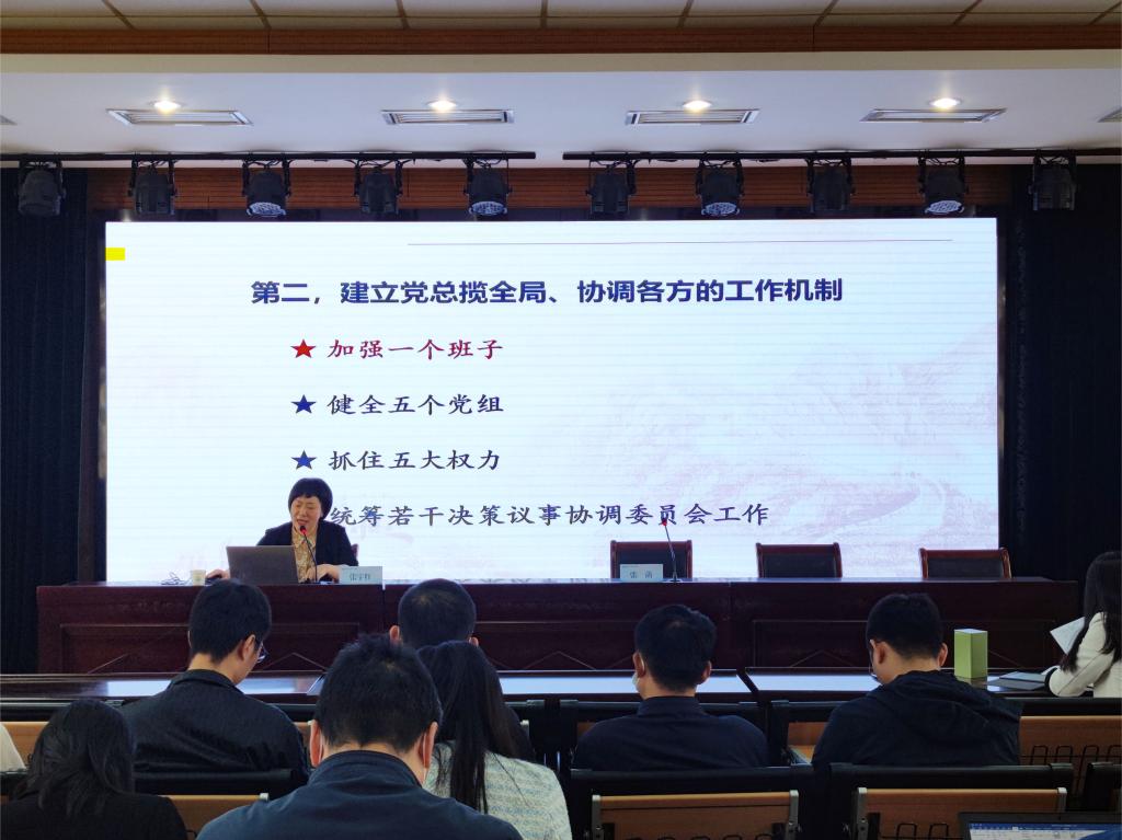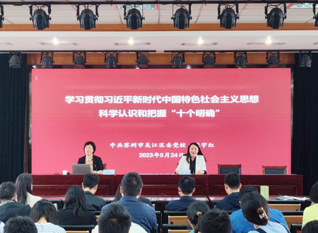 5月24日下午,蓝鲸 举办了学习贯彻习近平新时代中国特色社会主义思想主题教育读书班专题讲座,院党委理论学习中心组全体成员,全院教职工、学生党员、青马研习社学生参加学习。院党委特邀学习贯彻党的二十大精神吴江区委宣讲团成员、吴江区委党校副校长张宇红作专题讲座。会议由院党委书记张菡主持。