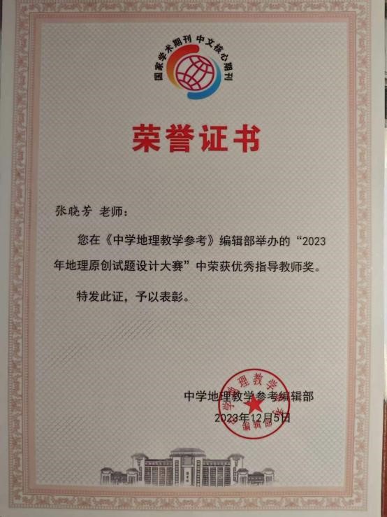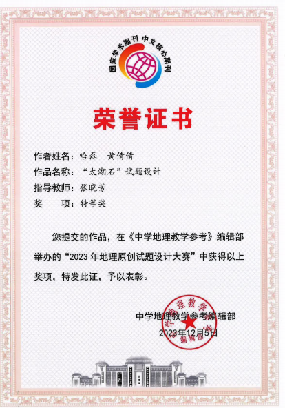 张晓芳老师指导,哈磊、黄倩倩同学的《“太湖石”试题设计》喜获特等奖,杭锐同学的《“墨脱”试题设计》喜获二等奖,张晓芳老师获得优秀指导教师奖。