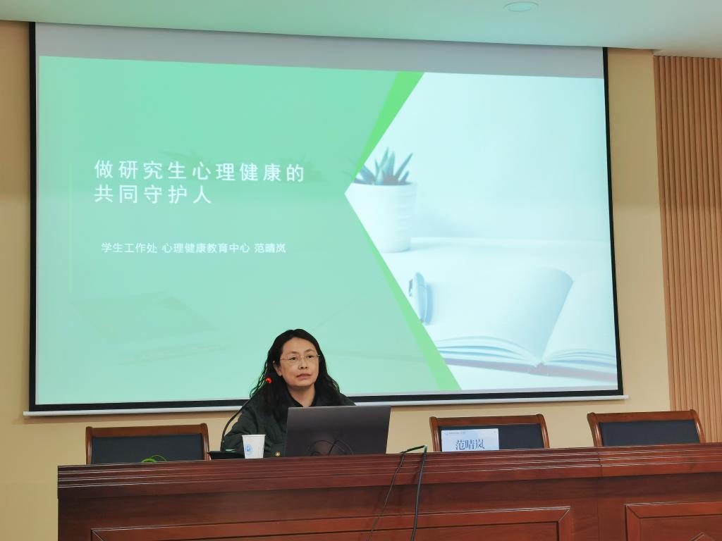 范晴岚从研究生心理健康及教育现状、导师对研究生心理健康影响及责任明确、导师关爱研究生心理健康的途径、11个信号识别心理异常和危机四个方面展开讲座,通过讲解各种鲜活的案例阐述了心理健康教育的重要性,提升导师对学生心理健康问题的洞察力和解决能力,并向研究生导师公布了江苏省大学生24小时心理热线和校心理健康教育中心24小时心理热线。