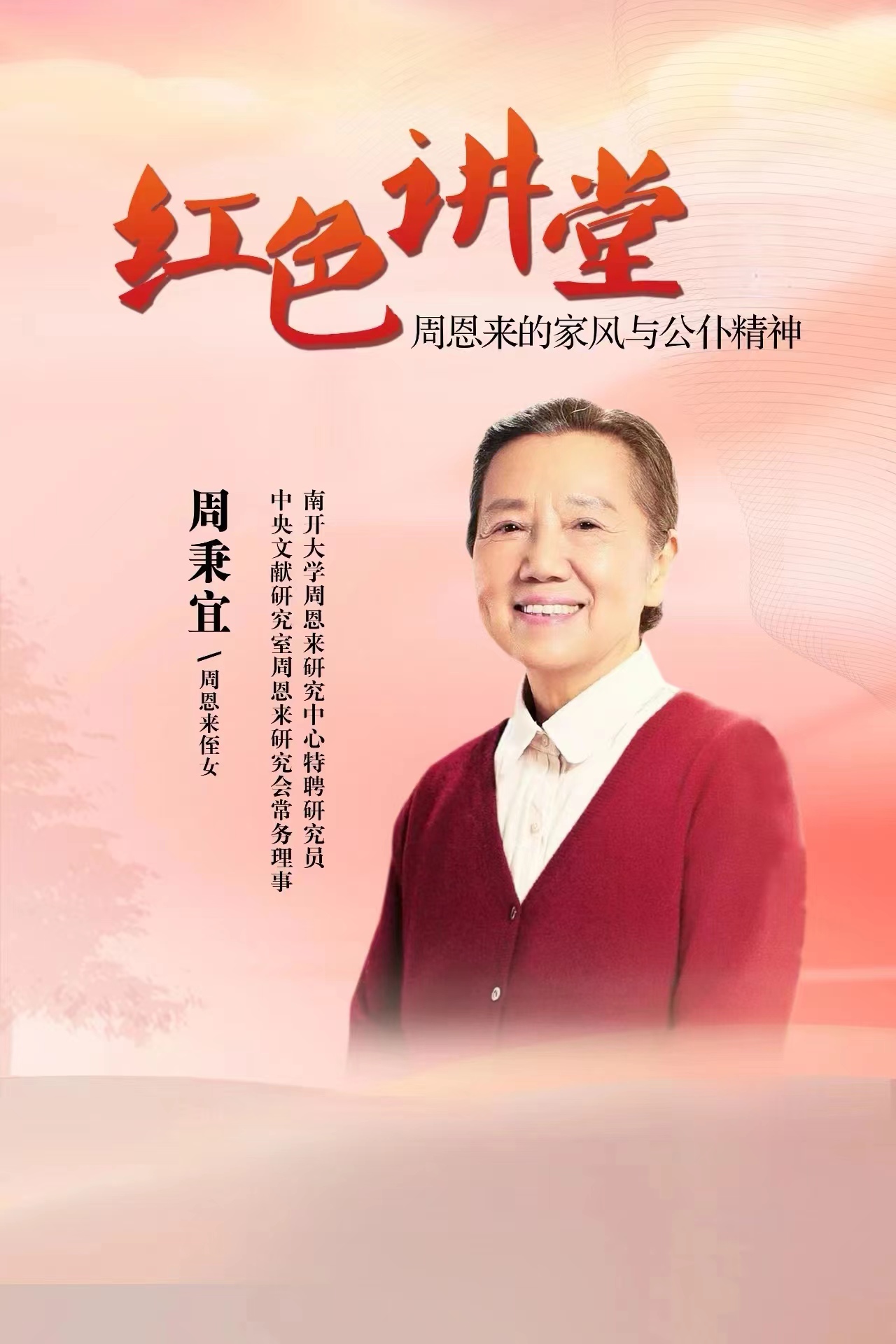 与杰出校友尹朝晖共联共建,组织参加“红色讲堂”党纪学习教育专题报告会。本次报告会邀请到中央文献研究室周恩来研究会常务理事、南开大学周恩来研究中心特聘研究员周秉宜女士主讲,题目为《周恩来的家风与公仆精神》。报告通过弘扬廉洁齐家的榜样力量,有力促进党风廉洁文化建设;以公仆精神深化正确政绩观的理解与践行,促进党纪学习教育落地生根、见行见效,构筑起拒腐防变的牢固防线。