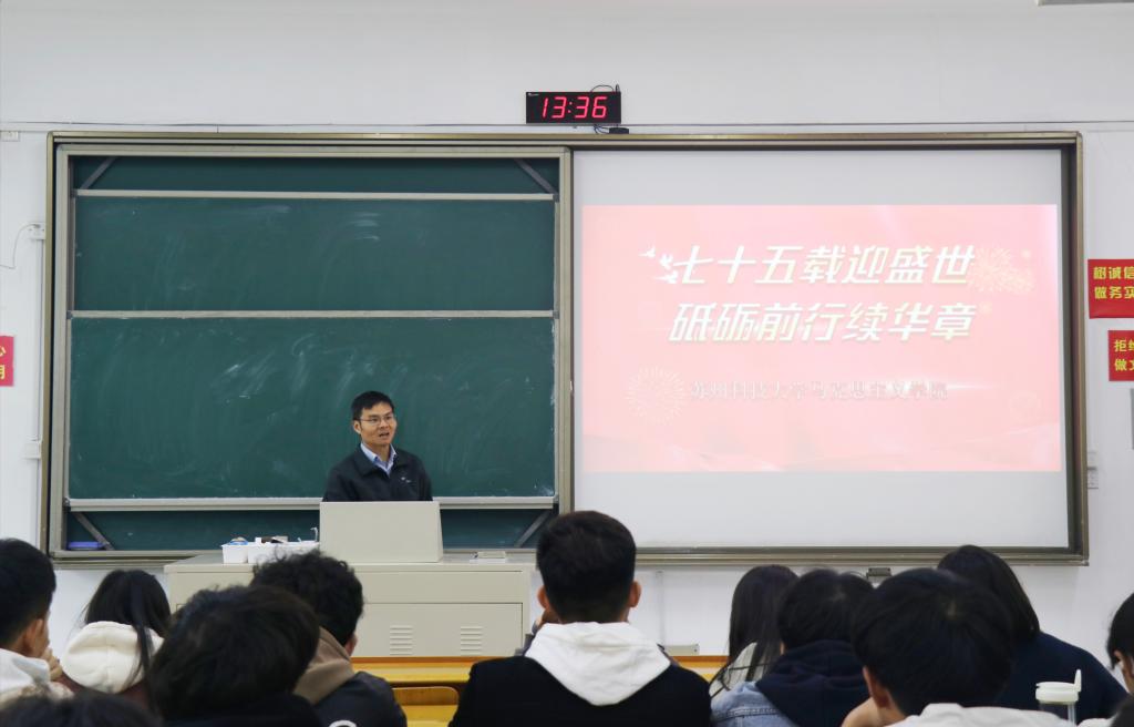 杨朝辉以“七十五载迎盛世,砥砺前行续华章”为主题,从“经济持续健康发展”、“民主之路越走越宽广”、“文化发展更加繁荣昌盛”、“人民生活显著改善提高”、“美丽中国焕发崭新容颜”等五大领域,全面展示了中华人民共和国成立75周年以来取得的辉煌成就。他勉励同学们要倍加珍惜这些来之不易的发展成果,更加坚定不移地支持中国共产党的领导,坚定不移地走中国特色社会主义道路,为实现中华民族伟大复兴的中国梦贡献自己的智慧和力量。