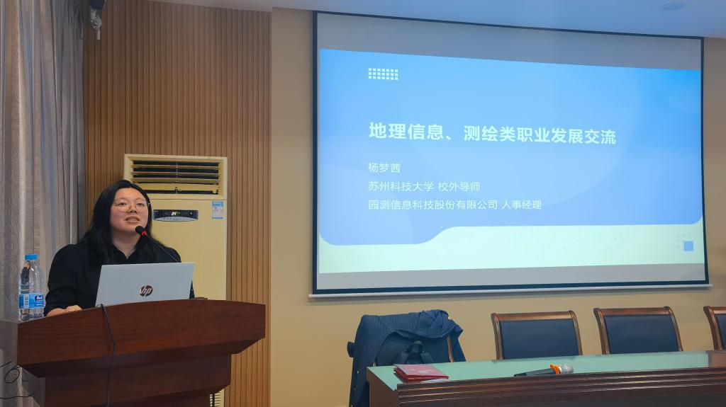党委副书记兼副院长彭科为杨梦茜女士颁发聘书,并表达了诚挚感谢。随后,杨梦茜女士分享了《地理信息、测绘类职业发展交流》。凭借丰富职场经验,她深入剖析地理信息与测绘类职业发展现状及未来趋势,详细介绍行业内各类岗位的职责与技能需求,分享求职技巧与职场礼仪。她以实际案例为切入点,生动解读企业人才选拔关注点,让同学们清晰认识到如何提升自身综合素质以匹配企业需求。来自苏州创元发展集团有限公司下属的国有机构苏州市因私出国服务中心有限公司顾问黄岑伟先生分享《低成本国际升学与跨专业硕士申请策略》。他详细讲解低成本国际升学的多种选择,介绍不同国家和地区的教育体系、留学费用及奖学金政策等,为同学们打开了解国际教育资源的新视野。