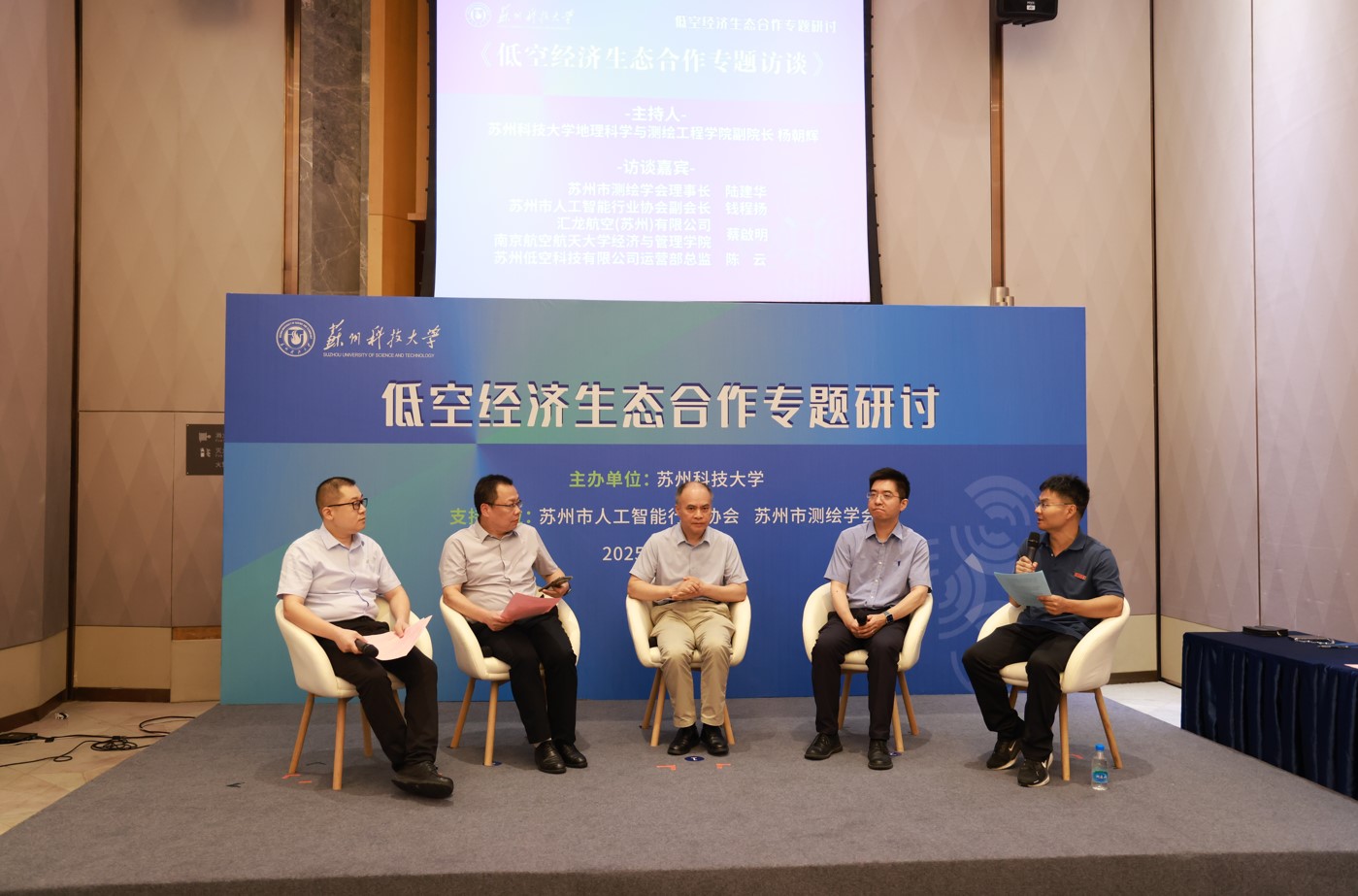 副院长杨朝辉主持了圆桌访谈环节。苏州市测绘学会理事长陆建华、苏州市人工智能行业协会副会长钱程扬、南京航空航天大学教授蔡啟明、苏州低空科技有限公司运营部主管陈云四位嘉宾围绕低空经济的生态构建、技术挑战与产业机遇展开深入探讨,现场气氛热烈。