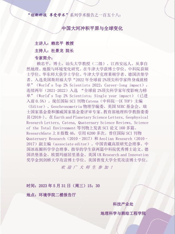 “创新科技 享受学术”系列学术报告:中国大河冲积平原与全球变化