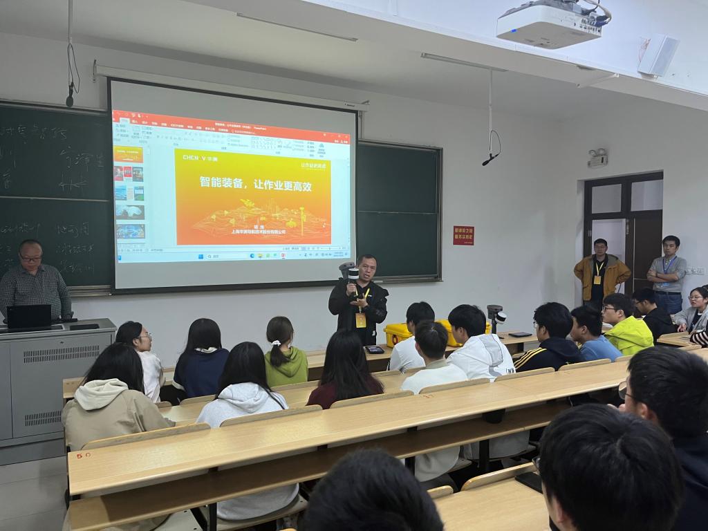 胡炜副总裁以《里斯本丸沉没》和热门3A游戏《黑神话·悟空》为引入,阐述了测绘科学与技术同当今社会的密切联系,同师生一起回顾了模拟测绘和数字测绘转向智能测绘的发展历程,探讨了在不同阶段“如何把地球搬回家”。通过大量的应用案例,从RTK测量系统、激光雷达系统、无人机测绘系统和无人船测量系统等方面阐述了智能装备如何让作业更高效,展现了现代化智能化测绘科技的力量与魅力。会后三维产品线技术人员现场讲解并演示了RS10手持RTK三维激光扫描仪的使用。