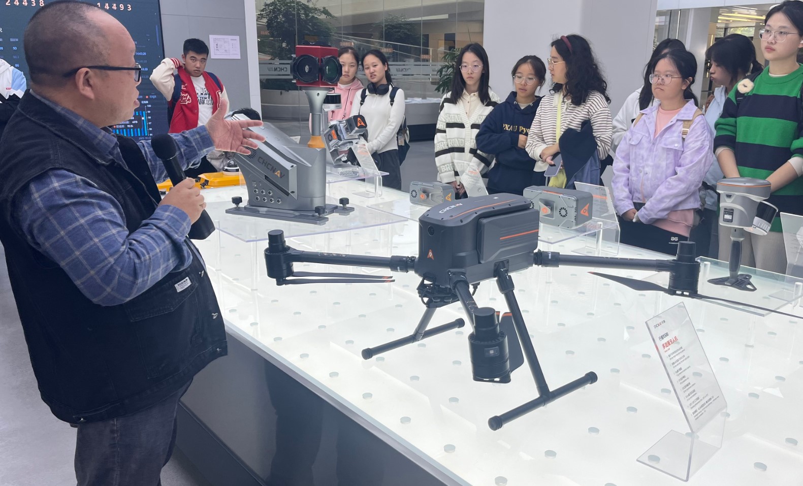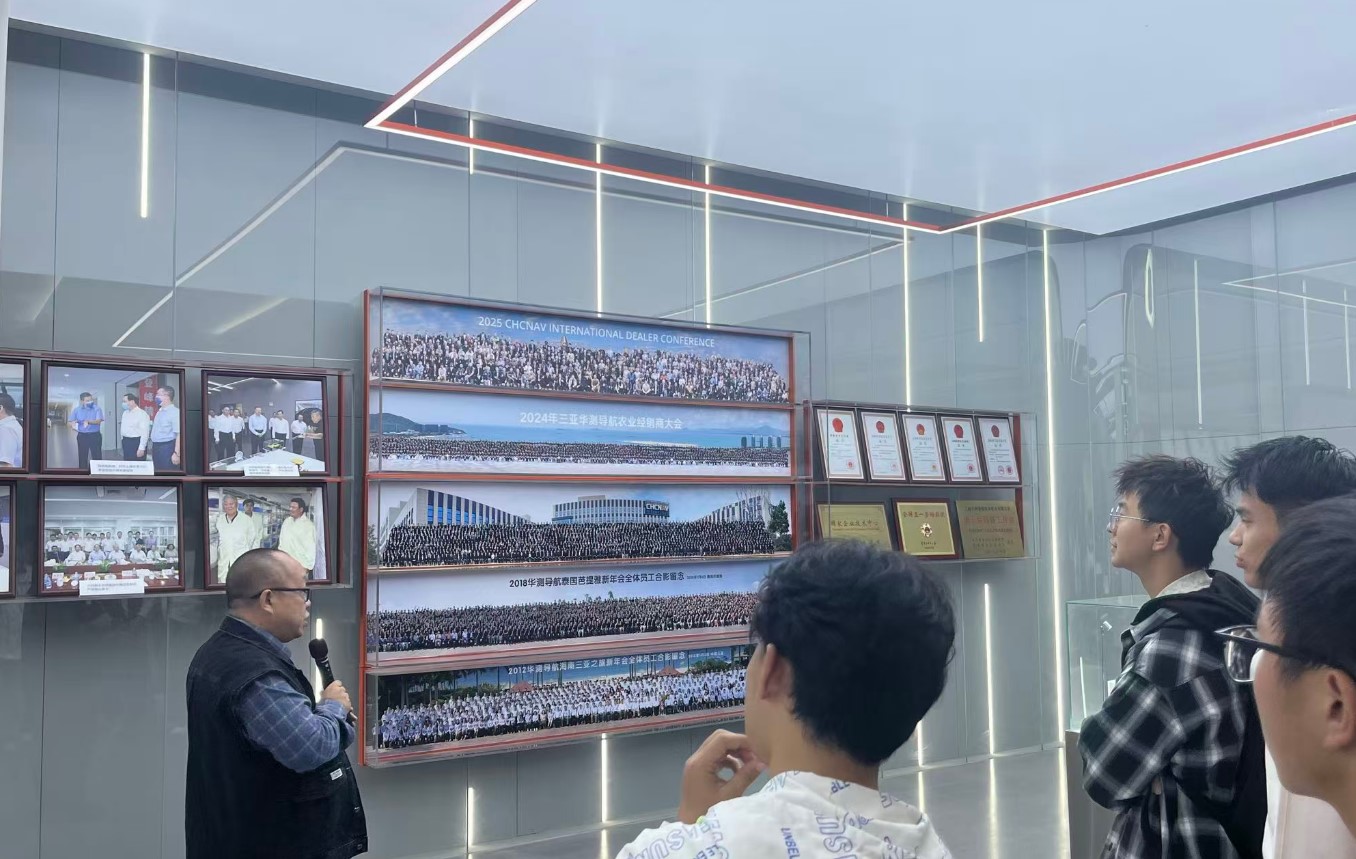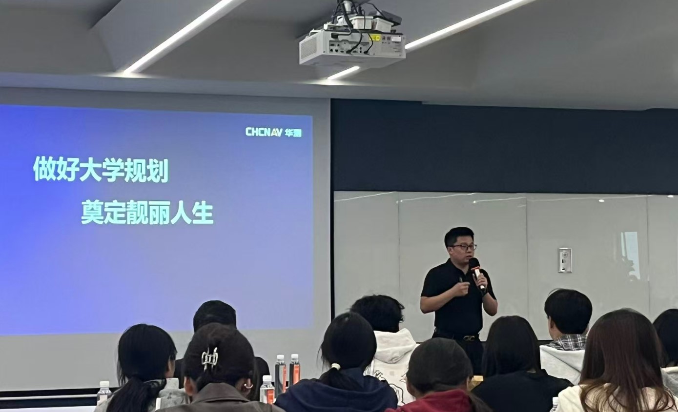 华测导航副总裁胡炜先生亲自为师生们介绍了华测导航的发展历程、公司在国家珠峰高程测量等重大项目中的关键作用,以及所获得的多项国家级科技奖项。重点展示了高精度导航定位装备、测绘无人机、无人测量船、自动驾驶农机系统、智能化监测设备等多元化产品矩阵及应用。